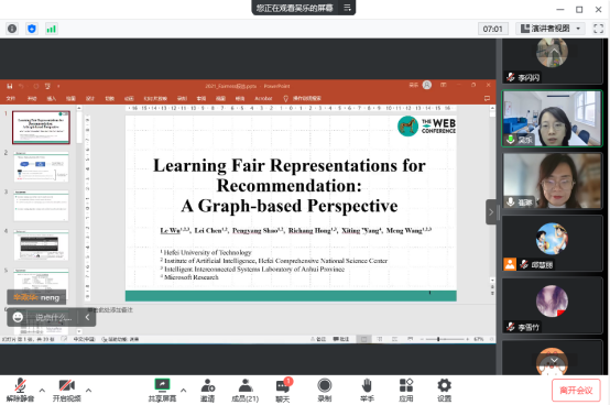 吴乐教授主要研究领域包括个性化推荐、可解释与公平性用户建模、数据挖掘及人工智能应用研究。近五年在知名国际期刊(如IEEE/ACM Trans.)及国际会议(如SIGIR、WWW、KDD、AAAI、IJCAI、SDM、ICDM、CIKM)发表论文五十余篇。吴教授此次报告的主题是“个性化推荐中的公平性研究”。首先引出了人工智能与个性化推荐中公平性研究背景;其次,简要介绍了当前公平性研究的进展,包括公平性度量指标及实现公平性的模型;最后,详细介绍了在个性化推荐中,如何通过挖掘用户行为图结构性质实现公平性。