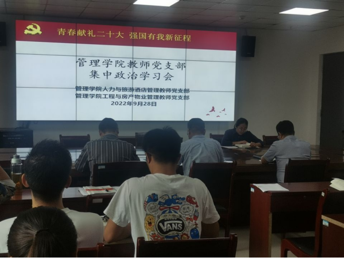 2022年9月28日下午,管理学院人力与旅游酒店管理教师党支部和工程与房产物业管理教师党支部在实习实训楼C301组织开展集中政治学习活动。教师支部书记及全体教师参加。