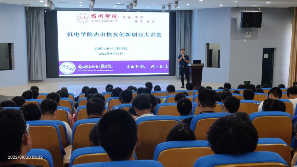 9月30日上午,机电学院举办杰出校友创新创业大讲堂,邀请校友安徽恒泰电气股份有限公司总经理范守保作专题报告。机电学院教学副院长王桂英、科研院长副刘从虎及2022级全体新生参加了报告会。会议由刘从虎主持。