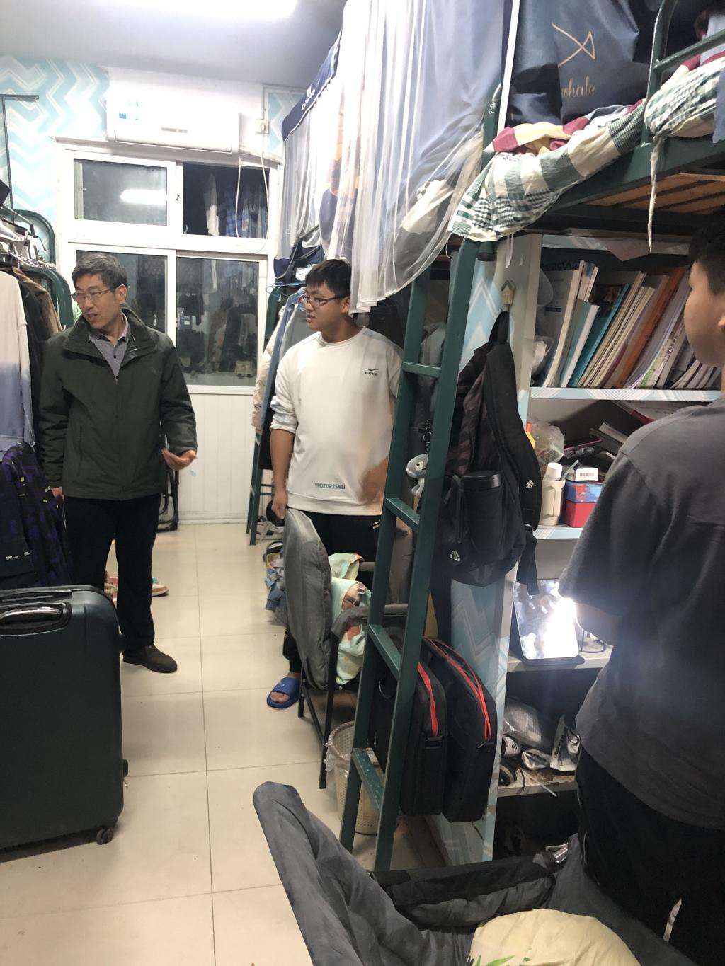 陈述立一行走进学生宿舍,与同学们进行亲切地交流,详细询问同学们的住宿情况和近期的学习生活感受,并与同学们交流疫情防控及安全知识、引导同学们严格遵守学校疫情防控期间校园管理工作要求、做好疫情防控常态化下的自我管理和个人安全防护。许兴海激励同学们好好学习,做好人生规划,珍惜学习时间,学好专业知识,提升自身价值。边洪强对宿舍卫生、物品摆放、值日安排制度等提出了具体要求,并将走访期间发现的问题及时反馈给相应辅导员。