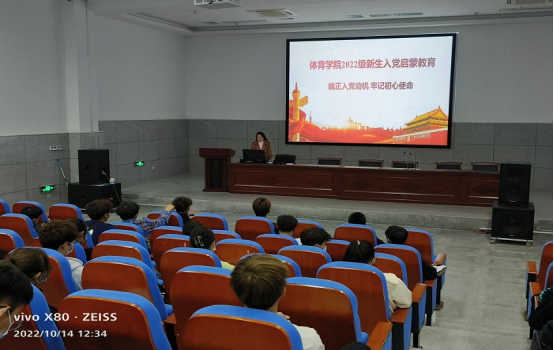 为切实做好2022级新生政治引导和入党启蒙教育工作,帮助学生提高对党的认识,做到早选拔、早教育、早培养、早发展,为做好学生发展党员工作奠定基础,体育学院于2022年10月14日中午在报告厅开展2022级新生政治引导和入党启蒙教育专题活动。活动由学生党支部书记王会敏主持。