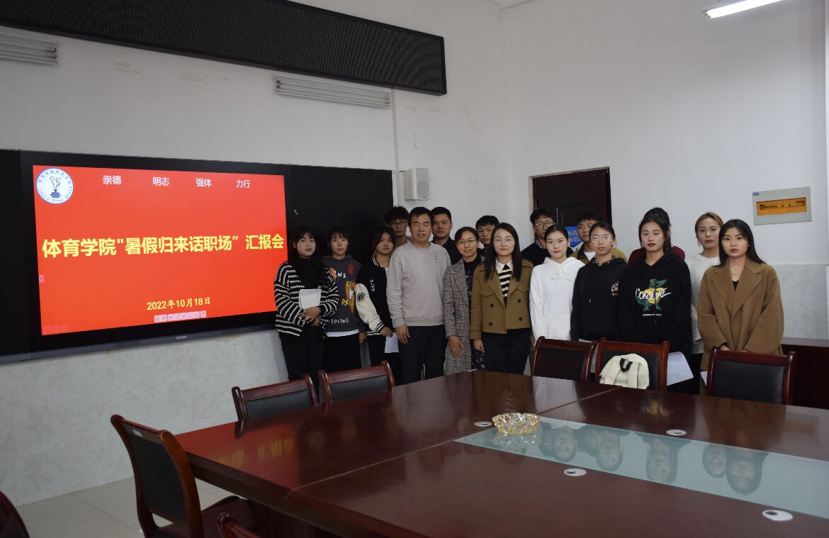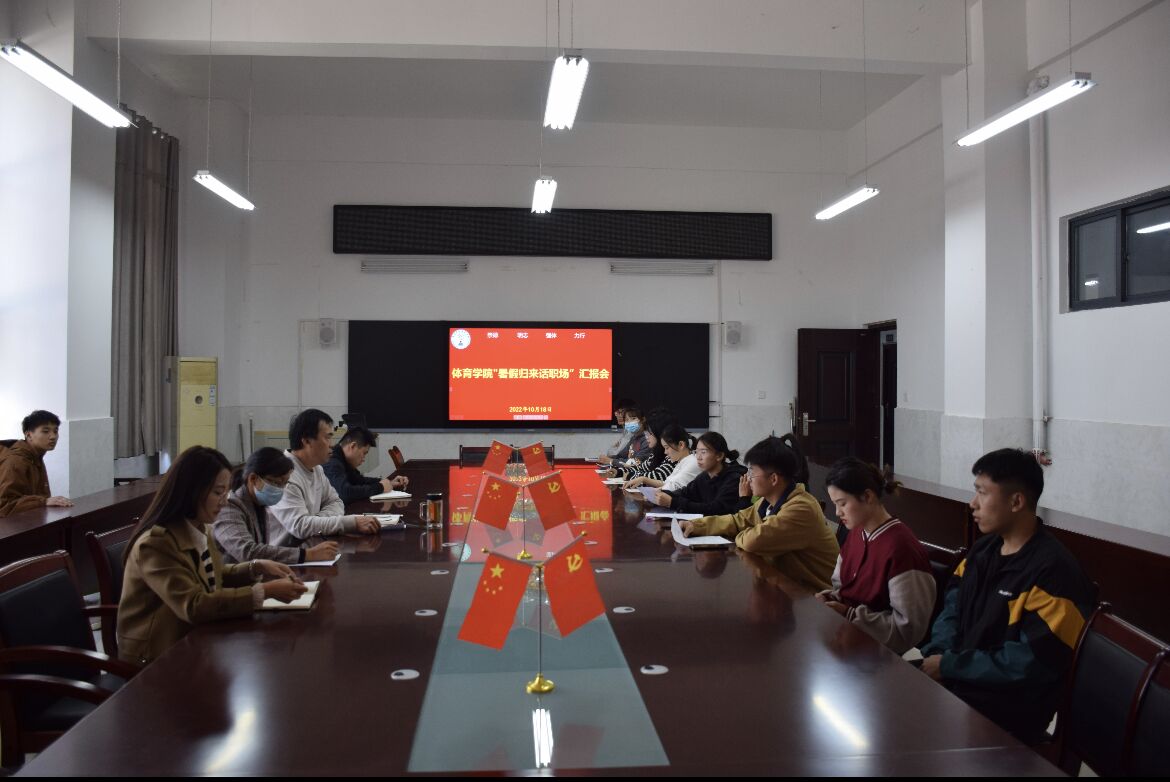 为了积极响应党委学工部关于开展“暑假归来话职场”汇报会的通知要求,通过分享大学生在社会实践过程中的收获感悟,深化实践育人成果,帮助青年学子在理论和实践相结合的过程中获得成长,体育学院于2022年10月18日中午,在体育馆会议室举办了“暑假归来话职场”的汇报会。体育学院党委副书记王德玉、学工科长江晓翔、体育学院全体辅导员及部分学生代表参加本次会议。