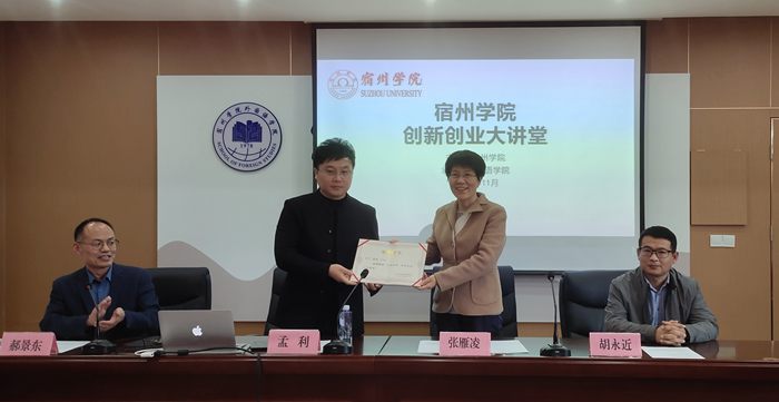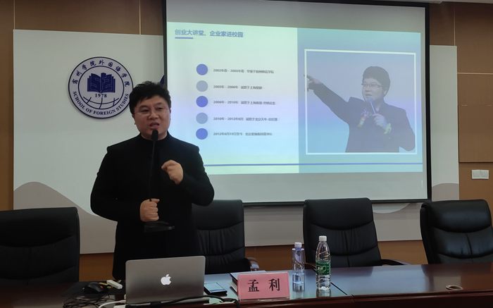 讲座开始前张雁凌向孟利发放外国语学院优秀校友证书;郝景东代表学院聘请孟利为外国语学院校外辅导员并发放聘书;胡永近代表学院聘请孟利为外国语学院创新创业导师并发放聘书。