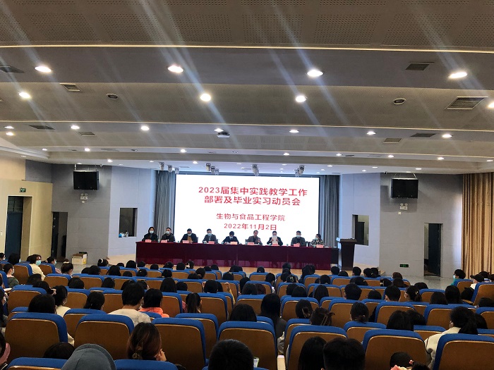 为保证我院2023届毕业生毕业实践教学工作的顺利进行,落实省教育厅相关文件精神,按照《关于开展2023届毕业生毕业实习工作的通知》(教务处发〔2022〕44号)等文件要求,2022年11月2日上午生物与食品工程学院2023届集中实践教学工作部署暨毕业实习动员会在招聘大厅召开。生工学院党委副书记、院长张兴桃、副院长(教学)王海潮,副院长(科研)翟科峰,党委副书记李娜,实习实训中心主任张东京及各专业教研室主任、毕业班辅导员及2023届全体毕业生参加,会议由王海潮主持。