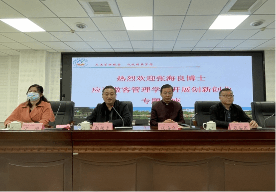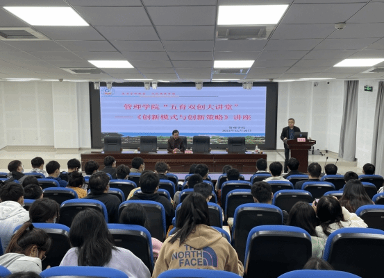 为提高师生对科研双创的认识,营造双创良好氛围,进一步引导和鼓励大学生自主创新创业,激发学院师生的创新热情,11月10日下午,管理学院特别邀请学院客座教授、武汉理工大学产业经济学博士、武汉大学社会学博士、中国中小企业协会副会长、科技部中国生产力促进中心协会博士专家服务团团长、博士100生产力论坛秘书长、北京今天胜德品牌管理咨询公司首席专家、聖德智库•聖德书院院长张海良博士于实训楼C103会议室开展“五育双创大讲堂”——《创新模式与创新政策》讲座。学院党委书记蔡若愚、副院长宋徽、部分教师及各班级学生代表参加了本次讲座。讲座由学院院长韩传龙主持。