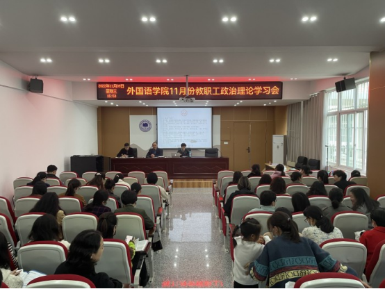 11月9日下午,外国语学院召开了全体教职工政治理论学习会暨学习宣传贯彻党的二十大精神部署会。会议由党委副书记(临时负责)郝景东主持,外国语学院全体教职工参加了会议。