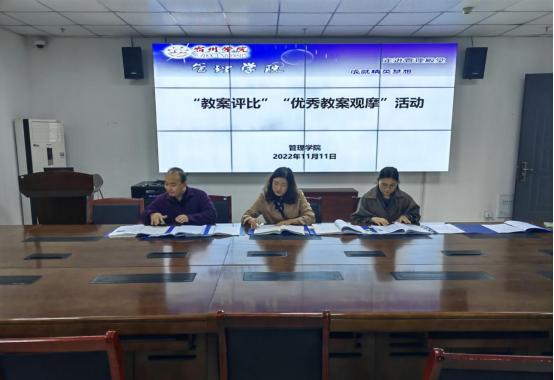 按照《关于开展2022-2023学年度第一学期“教师教学能力提升”活动的通知》(教务处发〔2022〕57号)和《关于开展2022年宿州学院“教案评比”“优秀教案观摩”活动的通知》(教务处发〔2022〕70号)等要求,促进青年教师不断提高课堂教学水平和教学质量,按照学院整体部署,管理学院于11月11日下午在实习实训楼C301会议室开展了“教案评比”和“优秀教案观摩”活动。活动由学院教学副院长宋徽主持。