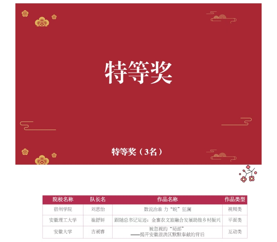 此次大赛,由安徽大学新闻传播学院与省内13家新闻教育单位联合发起。作为主办单位之一,文学与传媒学院高度重视,坚持“以赛育人、以赛促学、以赛促教”的理念,把指导学生参加比赛作为推动智能传播时代新闻教育创新发展的重要契机,广泛宣传,精心组织,从项目选题、谋篇布局、文案写作、图文制作、技术处理、视效提升等方面给予学生全方位的指导,取得了较好的效果。