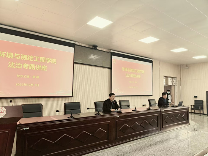 为贯彻落实党的二十大精神,增强学生法治观念,提高法律意识,营造文明、和谐的校园环境,12月7日下午,环境与测绘工程学院在逸夫楼第二会议室举办了2022年法治宣传专题讲座,学校法治科科长聂鹏受邀主讲,学院2022级全体新生、各班级法治宣传员、环测学院分团委书记杨文及辅导员代表参加了讲座。讲座由环测学院党委副书记、纪委书记李建新主持。