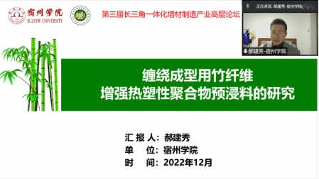 12月23日-25日,第三届长三角一体化增材制造产业高层论坛于在安徽省芜湖市顺利举行,本次论坛由安徽工程大学、繁昌区人民政府主办,采用线上线下结合方式举办。我院郝建秀博士在论坛上作了题为“缠绕成型用竹纤维增强热塑性聚合物预浸料的研究”的学术报告。