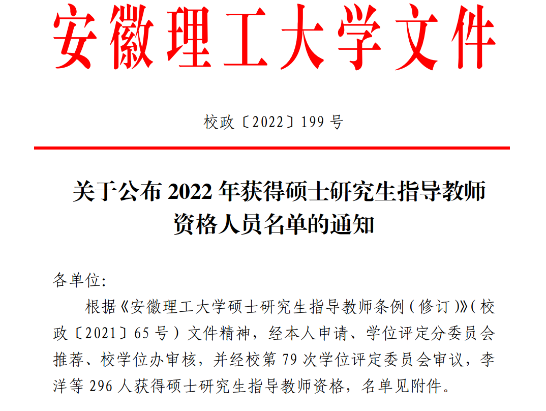 2022年12月21日,安徽理工大学发布了《关于公布2022年获得硕士研究生指导教师资格人员名单的通知》,公布了2022年获得硕士研究生指导教师资格人员名单,我院商学院刘红军教授获聘为安徽理工大学管理科学与工程学科硕士研究生导师。