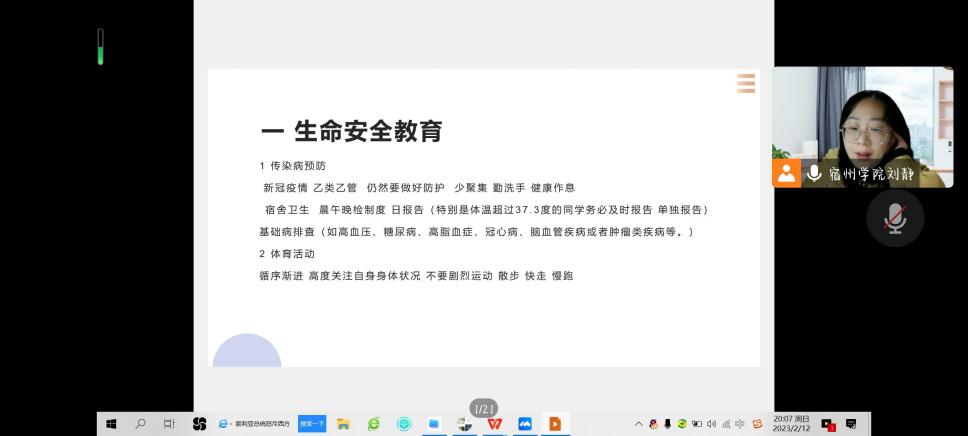 提高学生安全意识,防范风险与未然。辅导员通过班会提醒大家要注意疫情感染之后的身体保健,不做剧烈运动,做好春季防寒保暖,做好自己健康的第一责任人。在宿舍要注意用水用电安全,禁止使用违章电器,做好宿舍卫生工作,一旦发现安全隐患要第一时间上报。