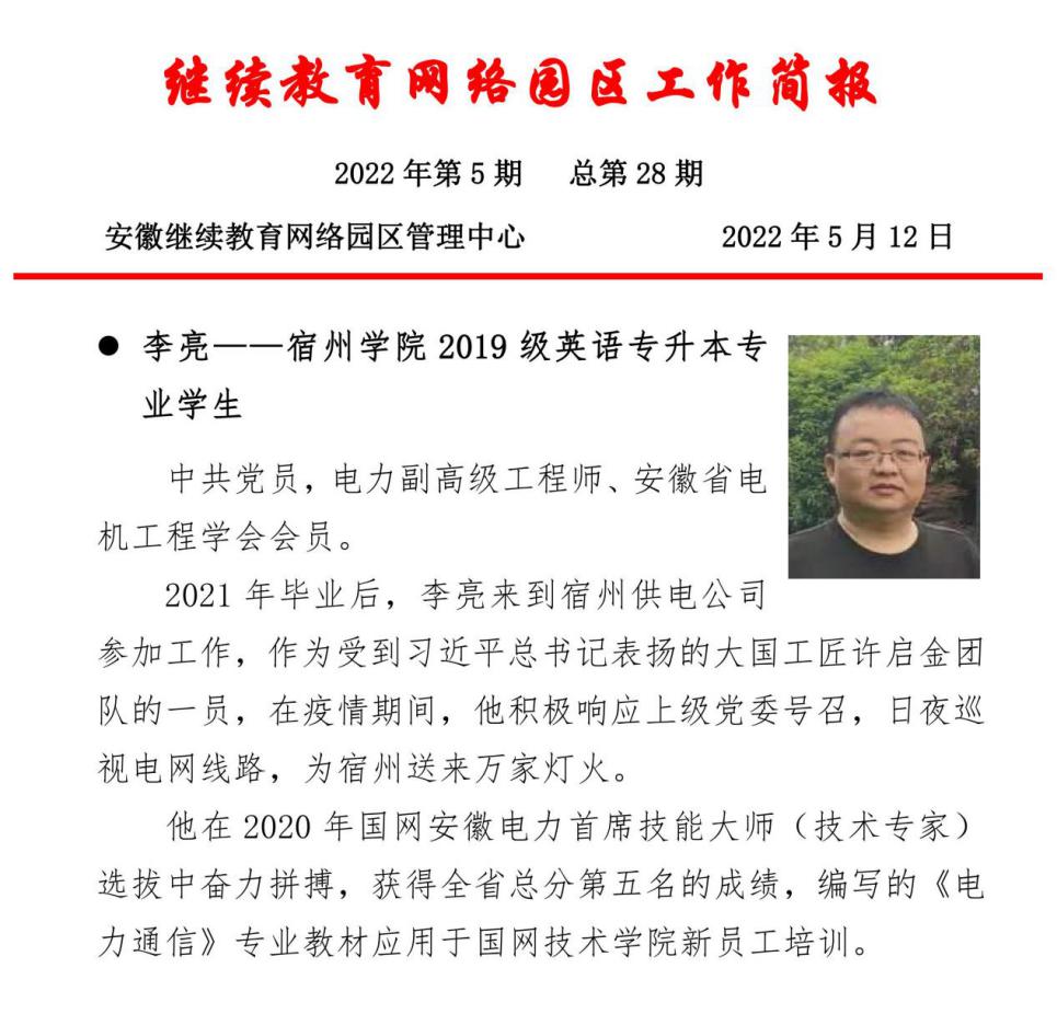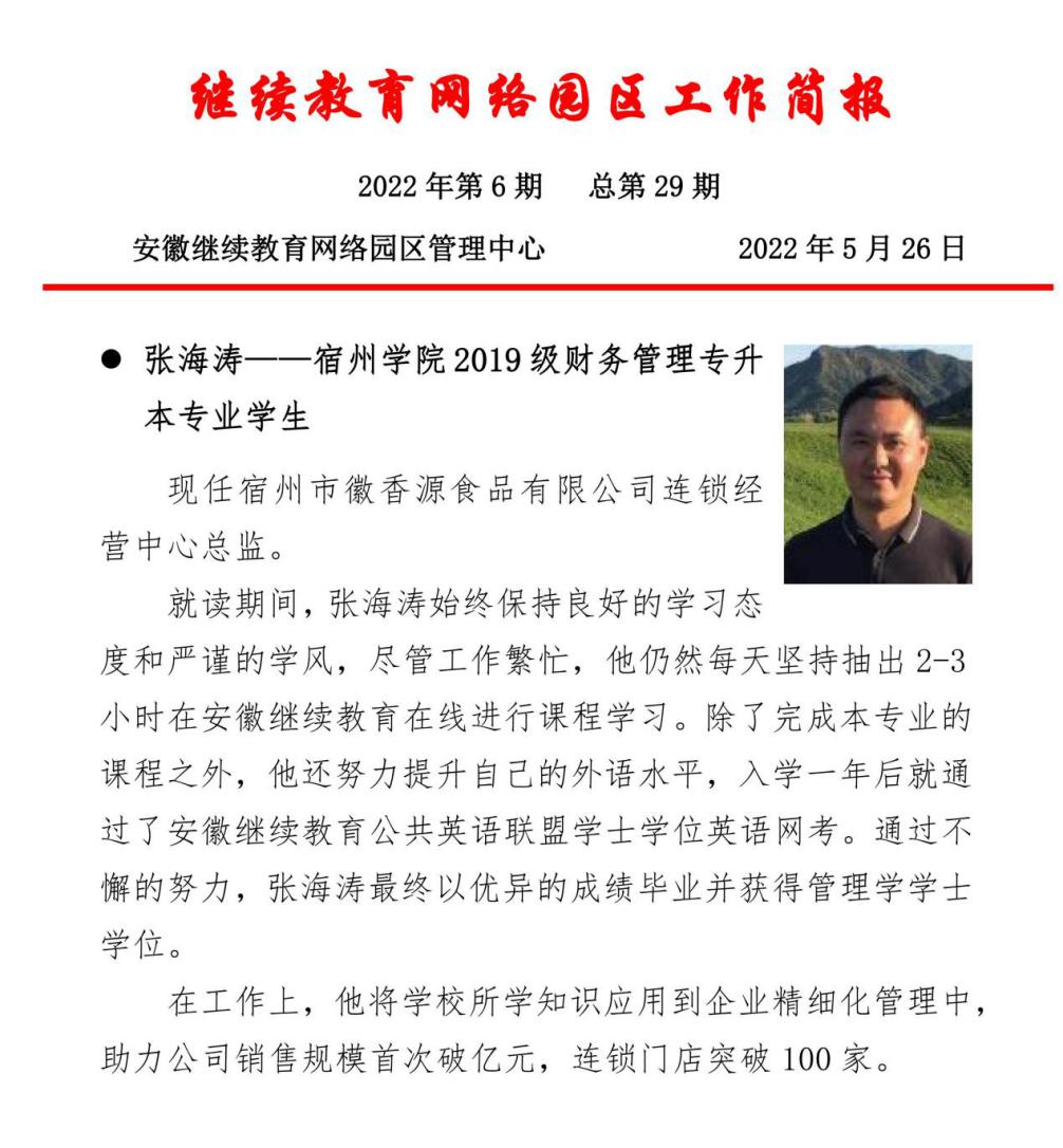 在安徽继续教育网络园区联合安徽高校继续教育合作开展的“高校学历继续教育优秀学员案例征集活动”中,经学员申报,高校推荐,资格审查和评审等环节,我院2019级英语专业李亮(宿州供电公司电力副高级工程师)、财务管理专业张海涛(宿州市徽香源食品有限公司连锁经营中心总监)成功入选。案例内容通过安徽继续教育在线平台、《高等学历继续教育学习指南》课程优秀学员案例模块以及园区简报等形式进行了宣传展示。