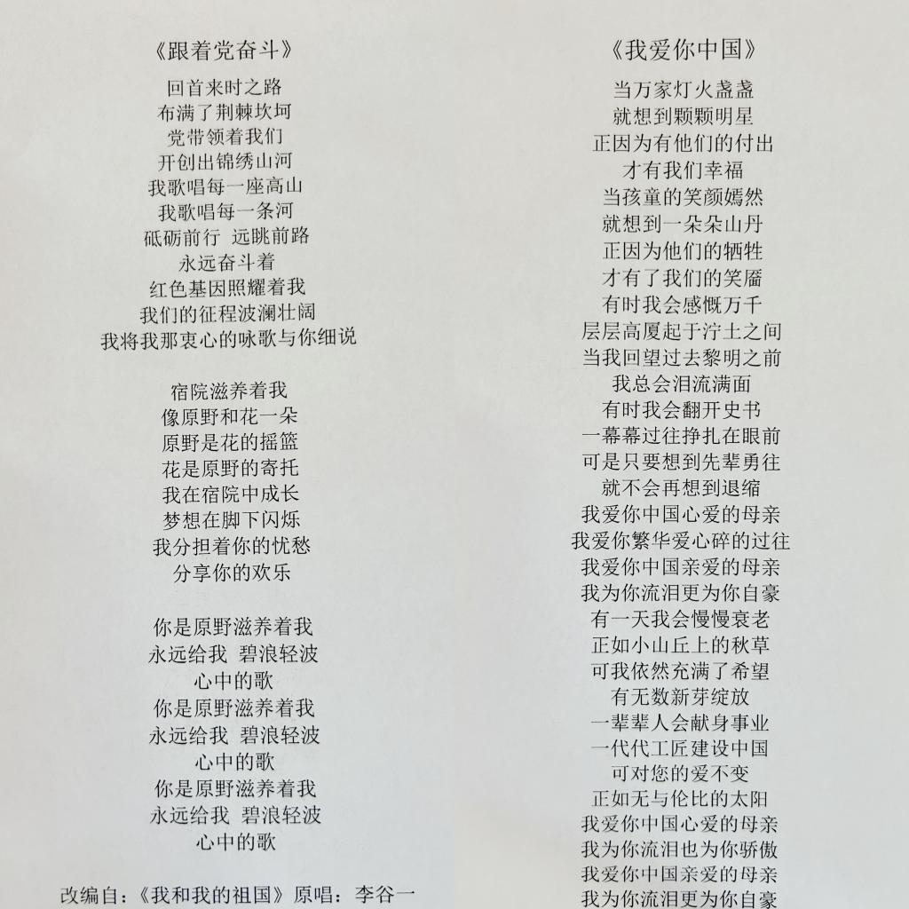 本次比赛的作品形式多样,内容积极向上,具有政治性、时代性和创新性,文辞生动,曲调优美,词曲押韵。商学院卞晓丹同学的作品《跟着党奋斗》,改编自《我和我的祖国》,其中写到“红色基因照耀着我,我们的征程波澜壮阔”;环境与测绘工程学院的赵洋同学改编了《走进新时代》,写到“让我告诉世界,中国青年意气风发;让我告诉未来,中国青年激情豪迈”;管理学院的李梦瑶同学改编《军中绿花》,写到“时代正在召唤,少年要坚定信念;积极向上是我们的标签,奋起拼搏报国家”。同学们通过作品,深入学习和阐释了党的二十大精神,表达了爱党爱国之情和担当时代重任之责,展现了当代大学生积极进取、踔厉奋发的精神面貌。