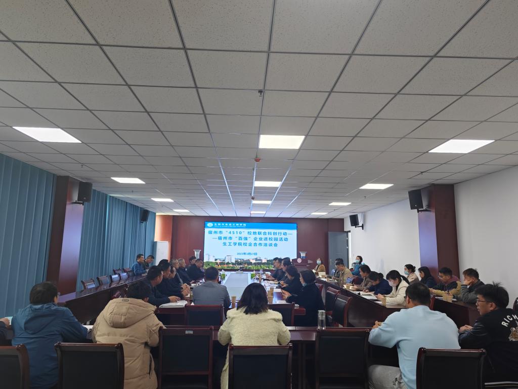 2023年3月27日下午,生工学院在学院会议室召开宿州市“4510”校地联合科创行动——宿州市“百强”企业进校园活动的第三阶段校地校企洽谈会。宿州市产投集团、宿州市农业科学院、宿州市埇桥区大豆产业协会、宿州市徽香源食品有限公司、安徽华成种业股份有限公司等12家企业前往生工学院参加了此次洽谈会。生工学院党委书记赵亮,党委副书记、院长张兴桃,副院长翟科峰、副书记李娜及部分博士教师参加会议,会议由生工学院党委副书记、院长张兴桃主持。