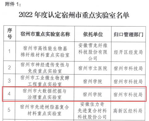 近日,宿州市科技局公布了2022年度宿州市重点实验室和工程技术研究中心名单的通知,由信息工程学院联合中国电信股份有限公司宿州分公司和安徽十锎信息科技有限公司申报的“宿州市大数据挖掘与治理重点实验室”喜获宿州市重点实验室。