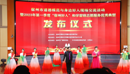 发布仪式对2023年第一季度“宿州好人”和学雷锋志愿服务优秀典型进行事迹发布,并为先进典型代表颁奖。本次发布仪式上,音乐学院受邀参加了两个节目:歌舞《春风十万里》和《人世间》,音乐学院教师顾大海、黄慧、吴味子以及舞蹈表演专业学生参加演出,大家精神饱满,舞姿优美,精彩的表演赢得了观众的热烈掌声。