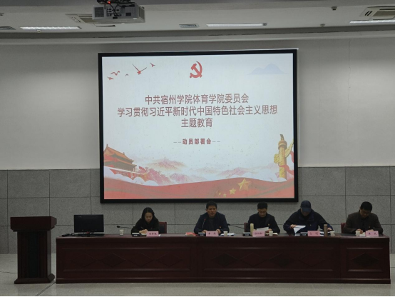 为深入开展学习贯彻习近平新时代中国特色社会主义思想主题教育,2023年4月24日中午,体育学院在报告厅召开了学习贯彻习近平新时代中国特色社会主义思想主题教育动员部署会,体育学院全体党员参加了动员部署会,宿州学院主题教育第三督查组组长张劲松,成员胡梦晓、梁武到会指导。动员部署会由体育学院党委书记李高主持。