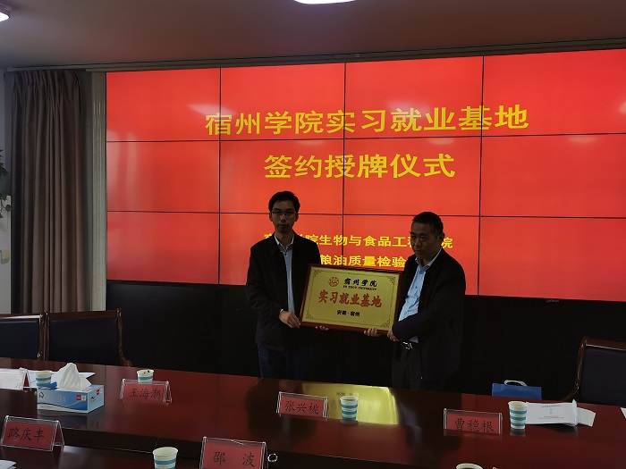 为进一步加强校企合作、拓展实习就业基地。2023年4月28日下午,生物与食品工程学院与宿州市粮油质量检验中心举行实习就业基地签约授牌仪式,出席基地挂牌仪式的有:生工学院院长张兴桃、副院长(教学)王海潮、曹稳根教授及实习实训中心主任张东京一行五人以及宿州市粮油质量检验中心主任邵主任等人员。