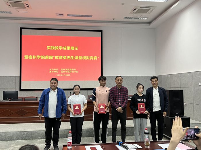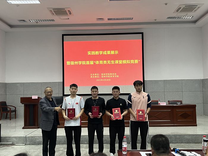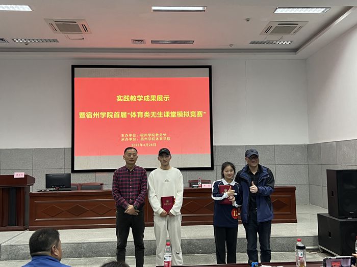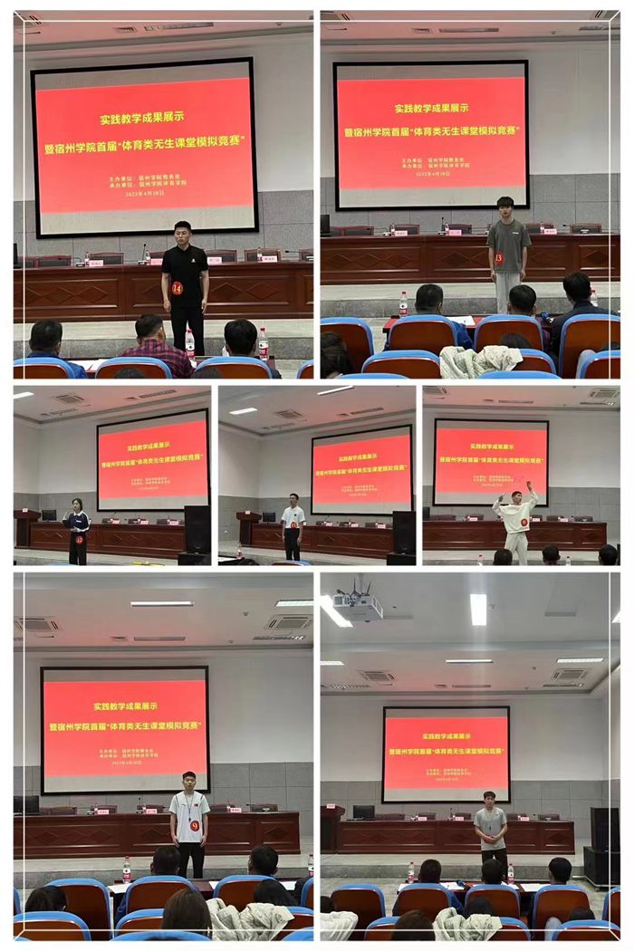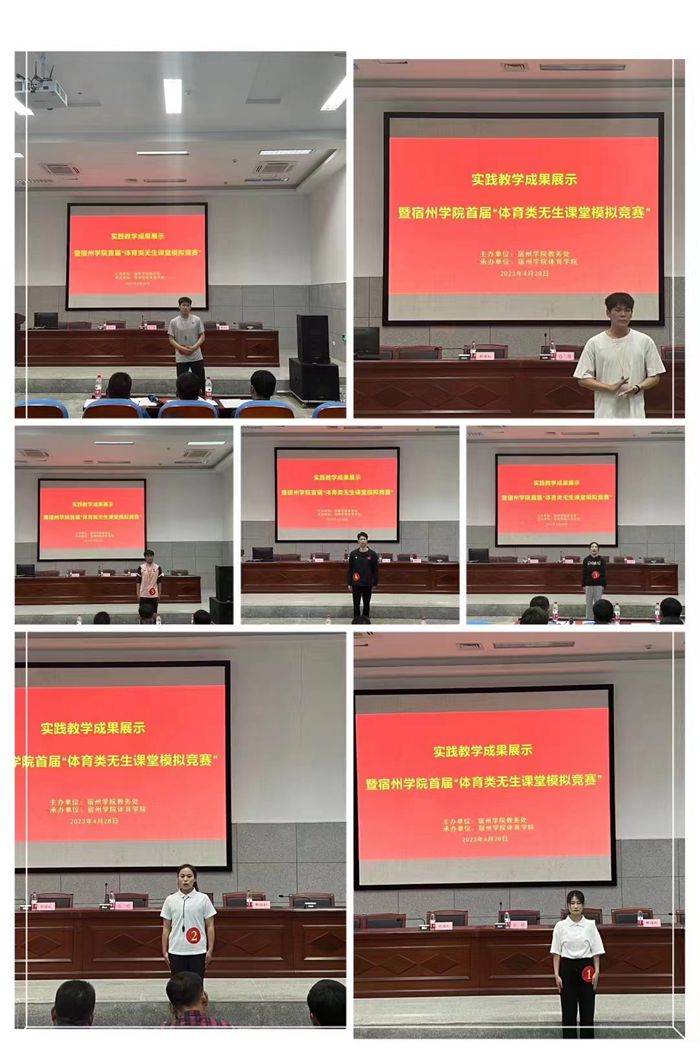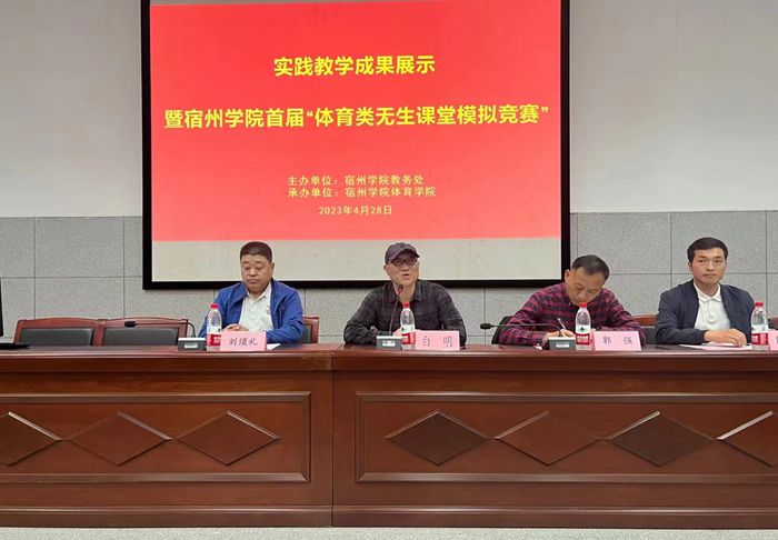 为深入贯彻党的二十大精神,学习贯彻习近平总书记关于教育的重要论述,本着“以学生为中心”的思想,创新实践教学模式,提高实践教学质量,推动实践教学内容和方法的改革,增强学生就业竞争力,保障体育学院顺利通过师范类专业认证。体育学院于4月28日下午,在体育馆B112报告厅举办了首届“体育类无生课堂模拟竞赛”活动。体育学院党委副书记、院长白明参加了本次活动,宿州市埇桥区教体局体育教研员、埇桥区体育工作室负责人郭强,中学高级教师刘须礼,以及宿城一中体育教师谢强利作为评委参加了本次活动,活动由实习实训中心主任张丽萍主持。