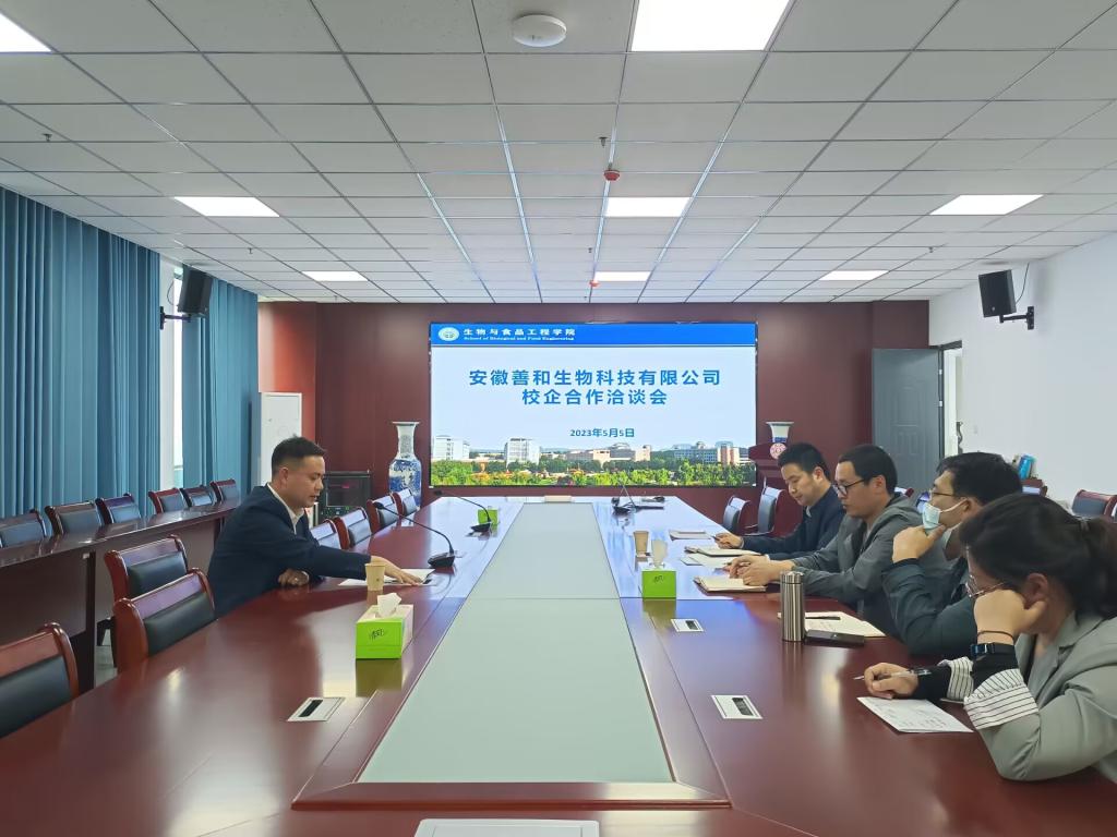 2023年5月5日,安徽善和生物科技有限公司行政经理朱进应邀来到宿州学院,生工学院副院长翟科峰及部分教师参加了洽谈会。双方代表团队就博士生合作事宜、合作方式以及合作前期的意向等问题进行了深入的交流。