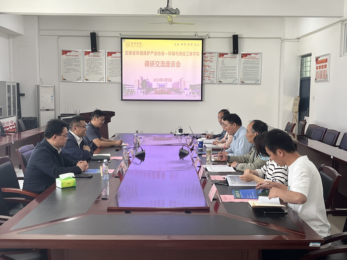 2023年5月9日下午,安徽省环境保护产业协会-环境与测绘工程学院调研交流座谈会于工科楼A315环境与测绘工程学院会议室召开。省环境保护产业协会常务副会长兼秘书长张登亮,支部书记程军,安徽复兴环保科技有限公司总经理吕志,环境与测绘工程学院院长张海洋,副院长徐国伟,地理与环境教研室主任刘娜及相关专业老师出席会议。张海洋主持会议。