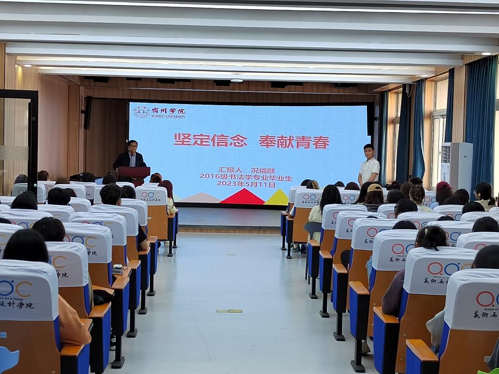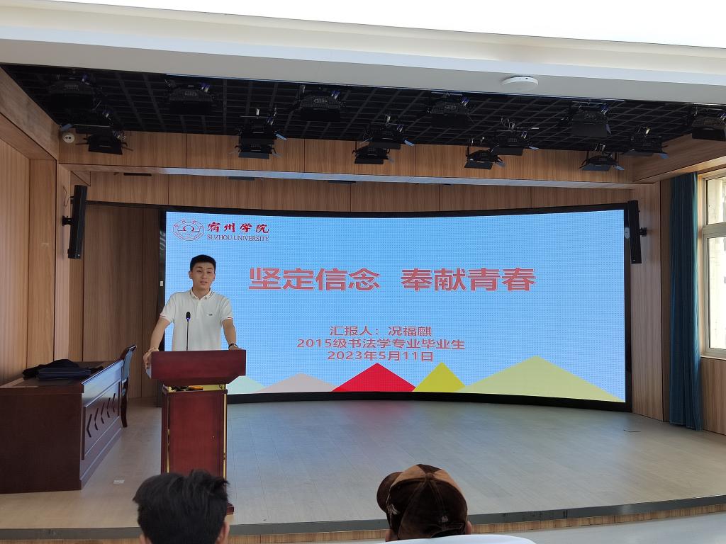 为深入学习贯彻习近平新时代中国特色社会主义思想主题教育精神,进一步落实我院就业决策部署,广泛宣传解读国家促进毕业生基层就业的有关政策,努力营造基层就业氛围,积极引导我院毕业生自觉把个人理想同国家社会的需求紧密结合起来,鼓励大学生踊跃到基层锻炼成才,报效祖国。2023年5月11日下午,美术与设计学院邀请2015级书法学专业毕业生况福麒来我院召开宣讲会,宣讲会由美术与设计学院党委副书记、纪委书记边洪强主持,全体党员以及学生代表参加。