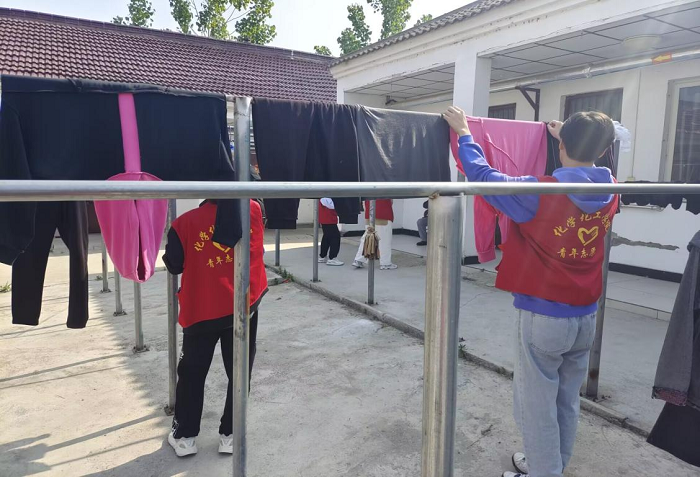 活动现场,爱心志愿者们分工明确,有的志愿者与老人们促膝围坐,亲切交谈,认真倾听老人们分享在敬老院中的生活状况,老人们也热情地和大学生们合唱“世上只有”“万水千山总是情”等歌曲,令整个敬老院充满欢笑声。志愿者们都认真听爷爷、婆婆讲述个人经历,使同学们了解到今天的幸福生活来之不易;同学们为老人洗衣服、晾衣服、打扫地面,把房间收拾的井井有条。大家用朴实而真诚的行动表达着对老人们的关爱,平日里清冷又寂静的敬老院一下子变得热闹了起来,院子里充满了大家的欢声笑语,处处彰显着和谐与融洽。