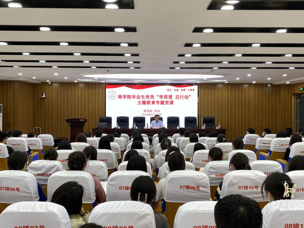 活动上,商学院党委书记肖良为118名23届毕业生党员上了“学思想 见行动”专题党课。党课围绕“学思想——学什么思想”“见行动——见哪些行动”,对习近平新时代中国特色社会主义思想的重要意义、核心要义、基本立场和观点方法等进行了深入阐释。他指出,广大毕业生党员要坚持用习近平新时代中国特色社会主义思想武装头脑,不断增强“四个意识”、坚定“四个自信”,切实做到“两个维护”。在进入社会后,一要加强党性修养,牢记党的教诲,不断锤炼党性,树立党员旗帜,充分发挥先锋模范作用;二要迎难而上,担起使命,不怕吃苦,在干中学、学中干,在担当中作为、在磨砺中成长,充分释放青春能量。
