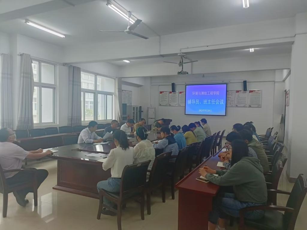 5月24日下午,环测学院在工A315会议室召开辅导员、班主任会议。环测学院党委书记胡冰,党委副书记、院长张海洋,党委副书记、纪委书记李建新,教学副院长徐国伟及全体辅导员、班主任参加会议。
