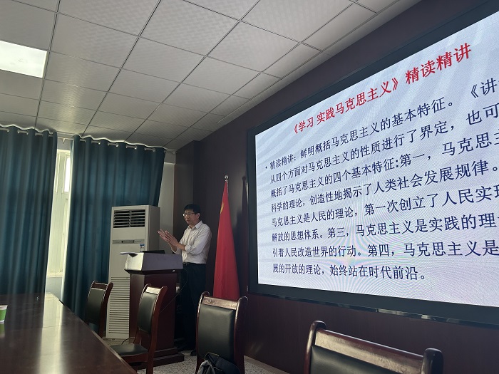 会上,黄凯领读了《习近平著作选读》第二卷中的《学习和实践马克思主义》。本篇著作是习近平同志在纪念马克思诞辰二百周年大会上重要讲话的一部分。黄凯不仅精讲了节选中明确列举的当前我们应该重点学习和实践的马克思主义九大思想观点:关于人类社会发展规律的思想、关于坚守人民立场的思想、关于生产力和生产关系的思想、关于人民民主的思想、关于文化建设、社会建设、人与自然关系、世界历史、马克思主义政党建设的思想,还对此次讲话的历史背景、未节选的内容和讲话后党和国家发生的变化作了系统论述。他强调,要立足于马克思主义的核心内容、立足于当代中国社会主义建设的主要领导和任务、立足于习近平新时代中国特色社会主义思想的原创性贡献来精读精讲。无论过去、现在还是将来,对马克思主义理论的学习,永远在路上,作为教育工作者、理论宣传者,我们要多读多练,学深悟透。