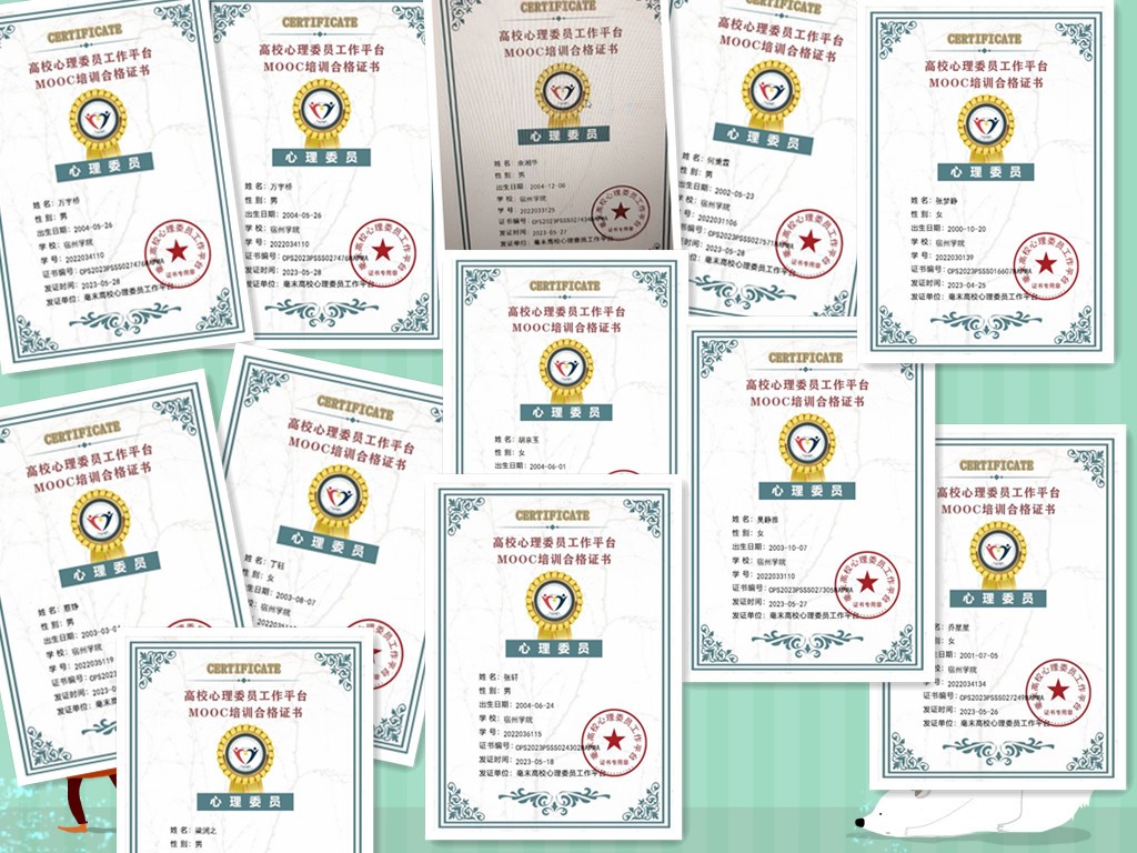 本次培训借助毫末平台,培训学习的课程为14个专题视频,完成学时要求,通过测试,通过认证的12名心理委员全部获取电子证书。