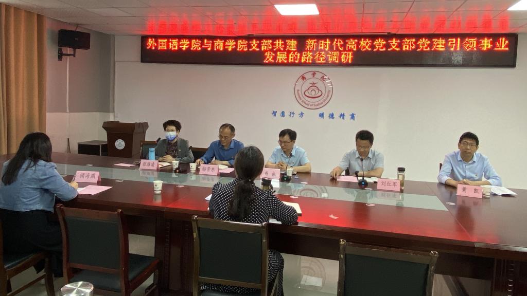 为切实增强抓好学习贯彻习近平新时代中国特色社会主义思想主题教育的思想自觉、政治自觉和行动自觉,以高质量党建引领高质量发展,5月31日下午,商学院电商国贸教研室教师党支部与外国语学院应用英语教师党支部在实训楼B517会议室举行结对共建签约仪式,并联合开展主题教育学习活动。商学院党委书记肖良、党委副书记、院长刘红军、组织员(正处级)黄凯、党委副书记、纪委书记周亚、科研副院长、电商国贸教研室教师党支部书记周书灵,外国语学院党委书记郝景东、党委副书记、院长张雁凌、应用英语教师党支部书记顾海燕,共建双方教研室主任及支部全体党员出席了签约仪式,仪式由刘红军主持。