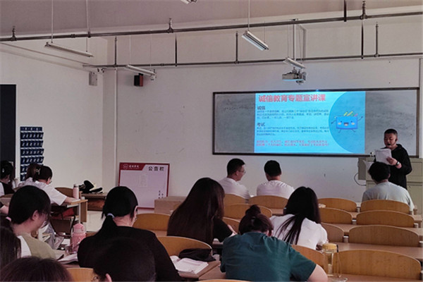 宣讲课上,孙茂顺老师借用名人事例,讲解了诚信的内涵和意义。他强调:作为一名大学生,诚信是最基本的品德。大家理当真诚待人,不信口开河,不做虚假学问,不行欺骗他人之事。同时,6月份将迎来高考、中考、四六级、期末等各类考试,全体同学应自觉做到不支持、不协助、不纵容、不参与考试作弊。最后,全体参会同学观看了考试违纪警示教育视频。