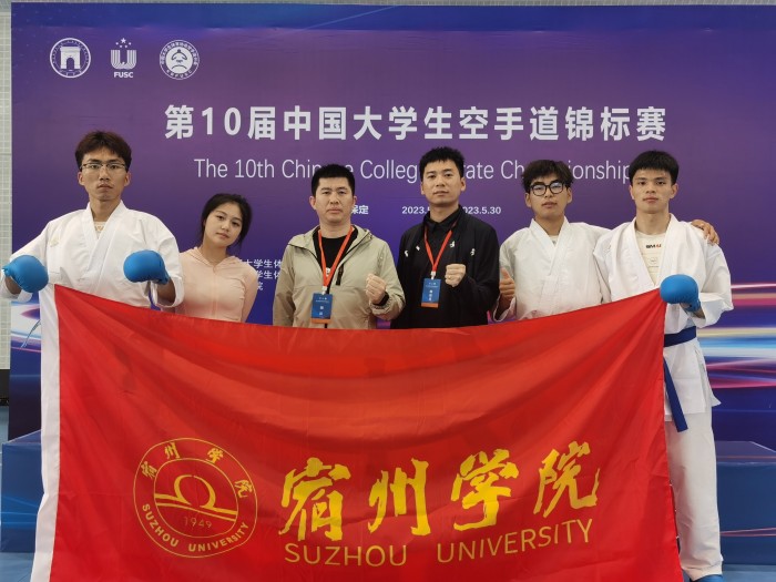 宿州学院首次组队参加中国大学生空手道锦标赛,2021级体育教育专业曹乐同学在本次参赛选手中,勇摘男子丙B组-79公斤级银牌,2020级体育教育专业王鑫、2020级体育教育专业吴奥运、2020级体育教育专业周雨晨三名同学努力拼搏获个人组手、团体型、个人型比赛全国第五名。