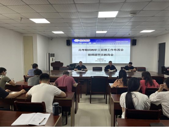 2023年6月7日,管理学院在教育园区实训楼C301召开高考期间教职工管理工作布置会暨师德警示教育会。院党委书记蔡若愚,院党委副书记、院长韩传龙,院党委副书记张增林及全院教师参加,会议由蔡若愚主持。