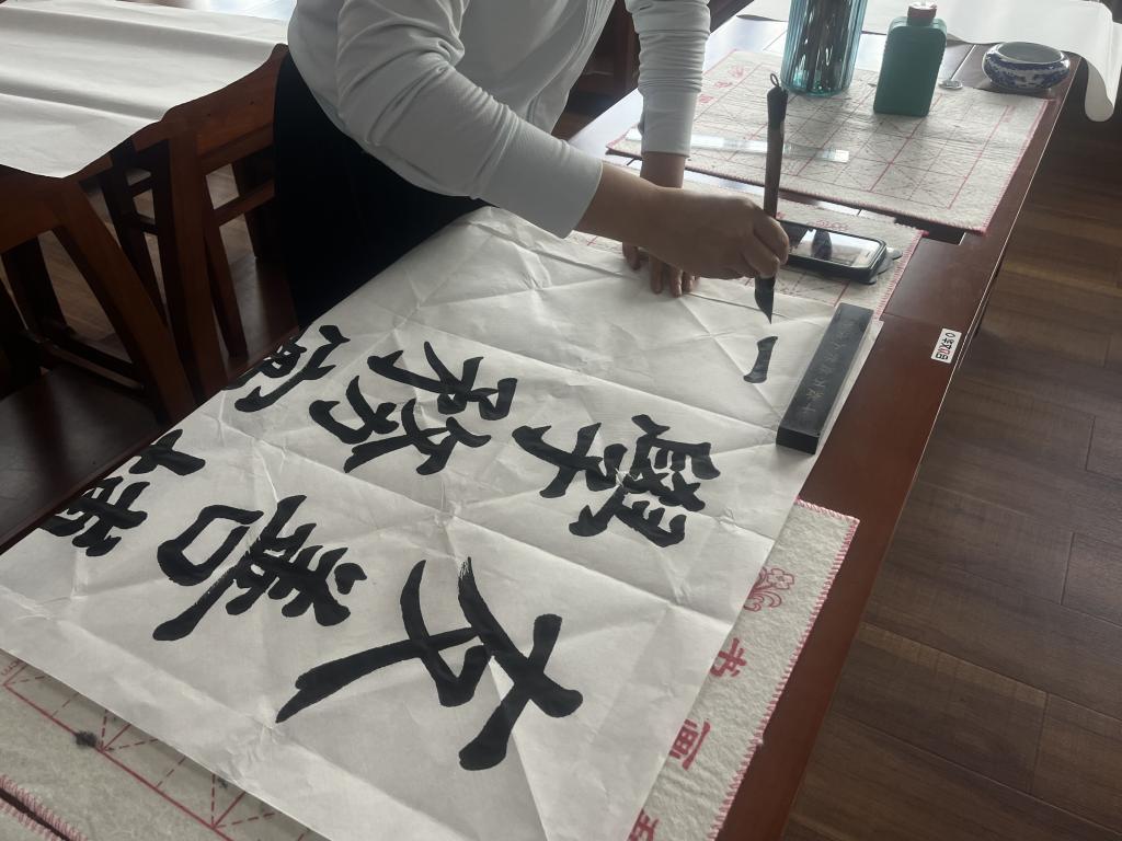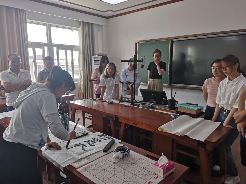 在书法实训室,应老师和同学们的强烈要求,冯倩提笔挥墨,书写宿州学院的校训,一笔笔铿锵有力,又如曼卿之笔,颜筋柳骨。她一边书写一边与师生交流心得,解释着一笔一划之间的书写道理,同时也将书法所蕴含的人生哲理道尽。