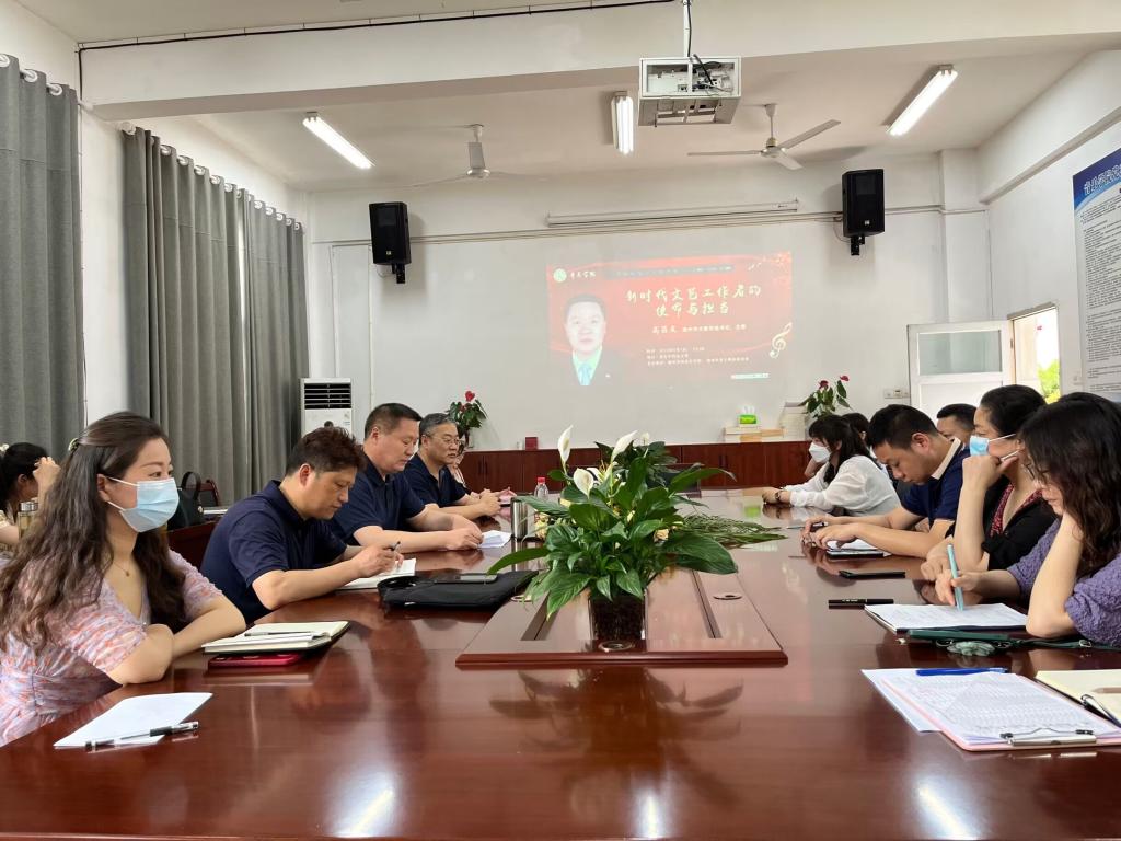 文艺事业是党和人民的重要事业,文艺战线是党和人民的重要战线,党的十八大以来,党中央高度重视文艺工作。为贯彻落实习近平总书记关于文艺的系列讲话精神,6月7日,宿州市文联党组书记、主席高昌友应院长王善虎邀请,到我院开展题为《新时代文艺工作者的使命担当》的专题讲座,学院全体教师及部分学生代表参加了讲座,讲座由王善虎主持。