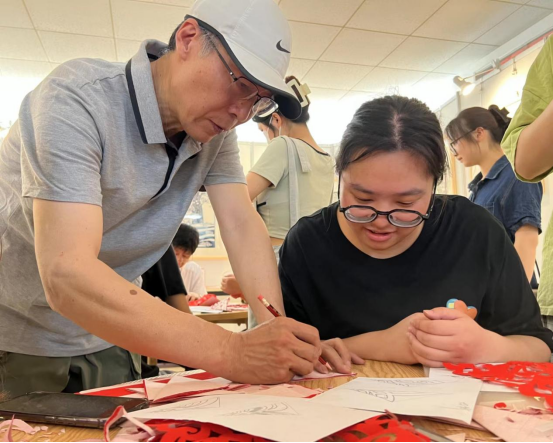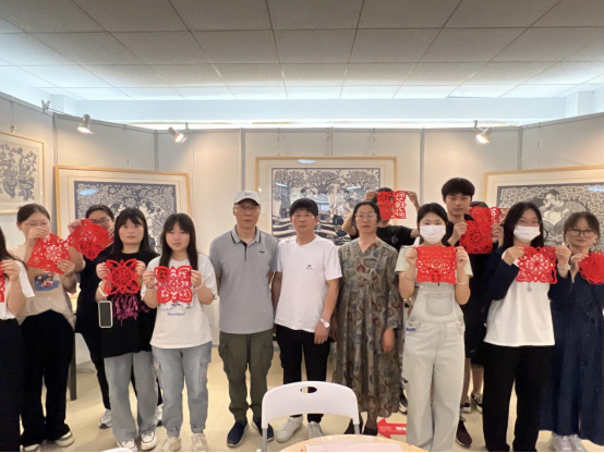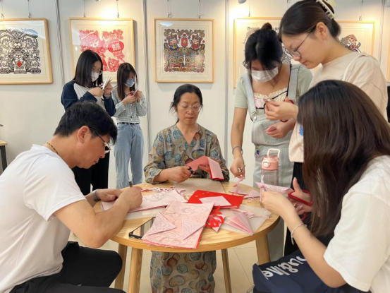 在展览现场,周康乐和剪纸艺术家王艳、张荣老师一起,指导师生剪刻吉祥花样,让大家动手的同时,加深了对中华优秀传统文化的认知理解,亲身感受剪纸艺术带来的独特魅力。