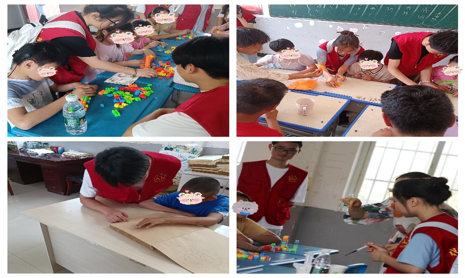 宿州市特殊教育中心始建于1988年,占地22000多平方米,现有教职工88人,班级27个,在籍学生555人(其中在校就读学生234人,送教上门学生321人)。是目前宿州市唯一一所集九年义务教育、高中教育、职业教育为一体,兼顾智障、视障、听障、自闭症、多重残疾等不同类型特殊儿童的综合性特殊教育学校。实践团队在活动期间针对视障、听障、智障、多重残疾等特殊孩童开展积木、折纸、物理生活小实验等不同类型课程,让这个特殊群体从不同的角度去感知丰富多彩的世界。对于视障学生,一起用黏土创造那小小心灵里的美好;对于听障学生,演示物理生活小实验,一起搭建积木,让孩子们去了解这个世界的神奇,让孩子们通过积木去构建自己心中所想;对于智障学生,一起做游戏,一起做课间操,一起折纸绘画,去感受他们的单纯美好;对于多重残疾学生,进行康复治疗教学等。特教中心的教室内气氛活跃,大学生与小孩子其乐融融。大学生给孩子带来全新的学习方法和生活方式,孩子让大学生深入了解了特殊儿童的单纯、美好、坚韧。