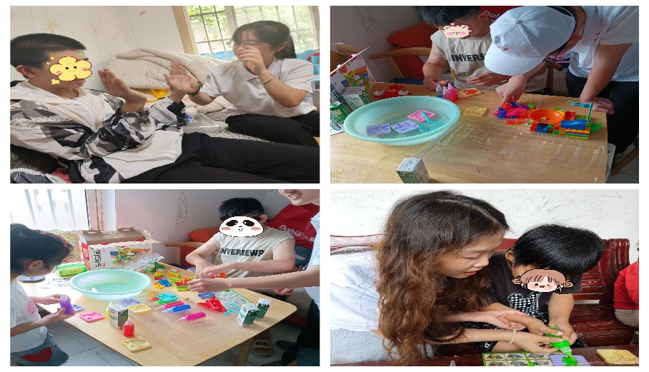 7月6日至7月10日,实践团队提前和学校负责人联系并初步了解了辖区内未就学的残障学生的信息,在阚淑锦老师和特殊教育中心贺老师的带领下开展“送教上门”志愿活动,去往不同的学生家里进行拜访。实践团队成员带着折纸、粘土彩泥、拼搭积木、益智玩具等,带着他们寓教于乐,在学习中成长和完善自身。通过和家长、孩子们的沟通去了解他们真正需要的是什么,并提供有效的帮助,解决他们生活方面的困难以及心理方面的问题。