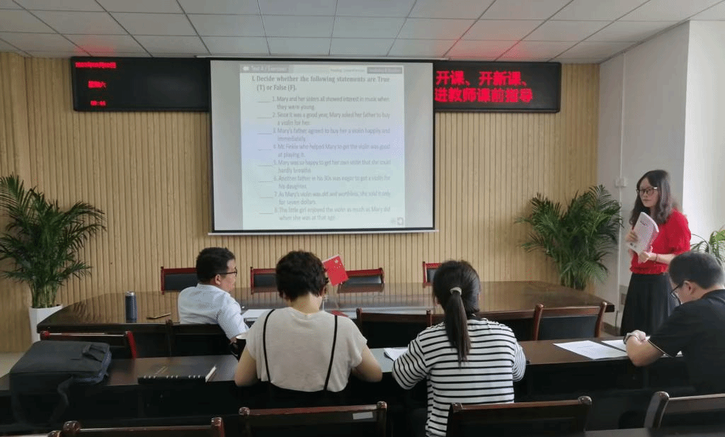 本次课前指导分为新任教师试讲和教学评价两个环节。试讲教师准备充分,教学思路清晰,能在教学内容中融入课程思政示范课程建设研究成果,得到了大家的肯定。杨曼老师讲授的主题为“Music instruments”的大学英语课程,将“中国精神”、“中国力量”等思政元素与教学内容巧妙结合,能润物细无声地激发学生的爱国主义情怀和奋斗精神。葛香杉老师讲授的主题是“A teacher’s story”,她将讲课内容巧妙地融入到与学生的互动交流中,在轻松流畅的氛围中,将知识点一一罗列,逻辑清楚,目标明确。