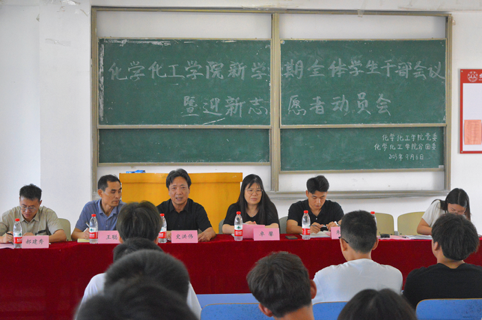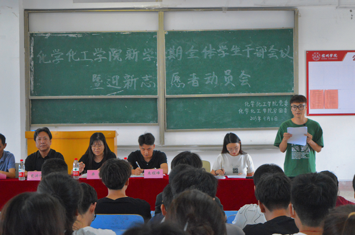 为做好迎接2023级新生报到工作,确保全体新生快速便捷完成报到,为新生提供更全面、更周到、更热情的服务,提高学生干部的责任与担当精神。化学化工学院于9月6日召开新学期全体学生干部会议暨迎新工作动员会。化学化工学院党委书记史洪伟,化学化工学院党委副书记、院长卓馨,化学化工学院副院长(教学)王聪,学生管理科负责人郝建秀,新生辅导员,全体学生干部和志愿者参加。