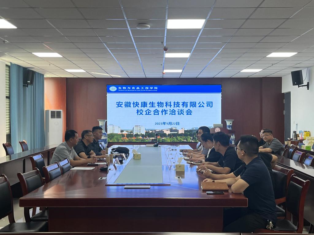 在暑期举办的宿州市“4510”校地联合科创行动县区(园区)行活动前期对接的基础上,2023年9月22日上午,泗县科技局副局长苗霖韬、安徽快康生物科技有限公司总经理罗军一行四人来生工学院进行实地走访,并开展校企合作洽谈会,生工学院副院长翟科峰,副院长王海潮,副书记李娜及部分博士教师和联合培养的研究生参加了此次洽谈会。