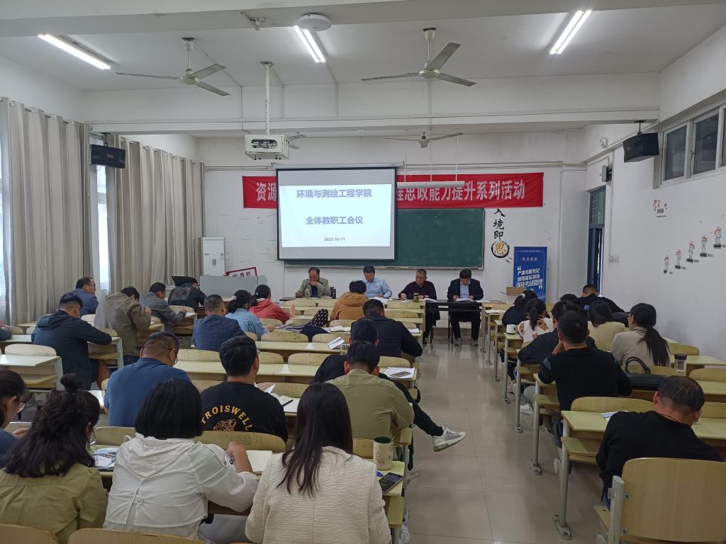 10月11日下午,环境与测绘工程学院在工科楼A楼106教室召开全体教职工会议,学院党委书记胡冰,党委副书记、院长张海洋,党委副书记、纪委书记李建新,教学副院长徐国伟及全体教职工出席了会议,会议由张海洋主持。
