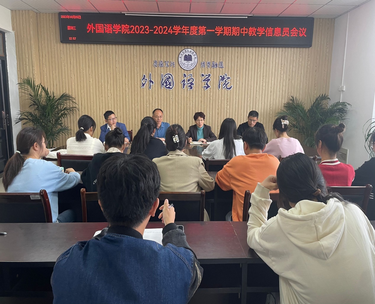 为充分发挥学生参与教学管理的主体作用,促进教学质量监控和信息反馈,10月25日中午12:30,外国语学院在逸夫楼A318召开了2023-2024学年第一学期期中教学信息员会议,会议由外国语学院院长张雁凌主持,院党委书记郝景东、副书记张亚锋和各班教学信息员参会。