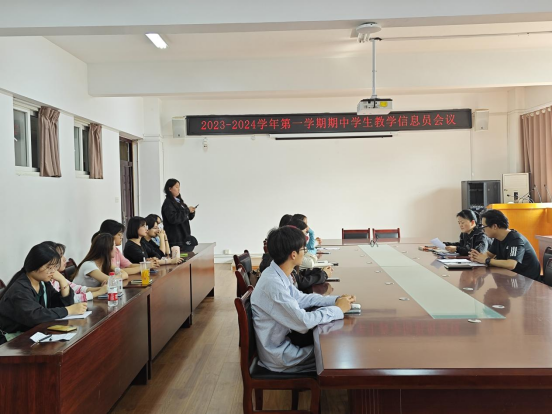 10月25日,2023—2024学年第一学期期中教学信息员会议在教学楼A303会议室召开。文学与传媒学院教学副院长李娟、教学秘书及学院全体教学信息员参加了会议,会议由教学秘书徐文斌主持。
