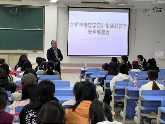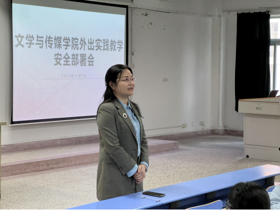 11月7日下午,文学与传媒学院召开外出实践教学安全部署会,文学与传媒学院党委书记王金岭,党委副书记、院长李月云,党委副书记刘影,外出实践教学带队老师及学生参加会议。会议由实习实训中心主任梁静主持。