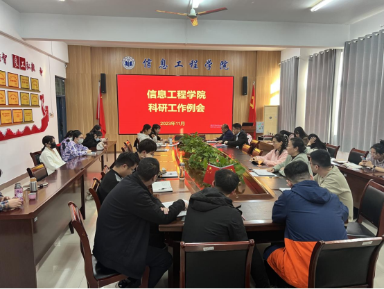 2023年11月8日下午在学院工B315会议室,信息工程学院召开11月科研工作例会。学院组织员黄永刚,党委副书记、纪委书记吴孝银,科研副院长崔琳,教学副院长潘正高及全体教职工参加会议。