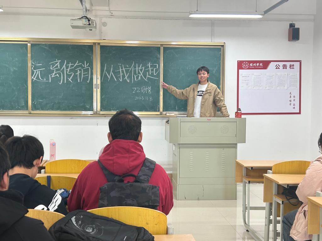 为提高广大学生对于传销活动的识别和防范能力,11月3日至10日,商学院各专业班级陆续开展了“反传销教育”主题班会。